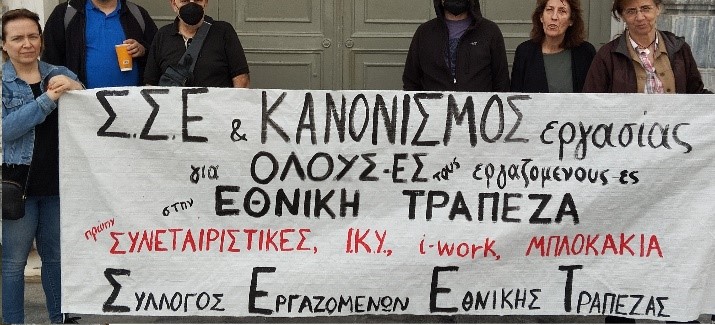 Την ίδια στιγμή η εντατικοποίηση τόσο στις διευθύνσεις όσο και στα καταστήματα έχει χτυπήσει κόκκινο, η ελαστικοποίηση των εργασιακών σχέσεων των ενοικιαζόμενων τραπεζοϋπαλλήλων συνεχώς αυξάνει, με συμβάσεις ορισμένου χρόνου ενός (1) μήνα ενώ μέχρι και το Υπουργείο Οικονομίας αυτής της κυβέρνησης έφτασε να κάνει «συστάσεις» στις τράπεζες (μέσα σε αυτές και την Εθνική) για την πολιτική προμηθειών απέναντι στους πελάτες τους!